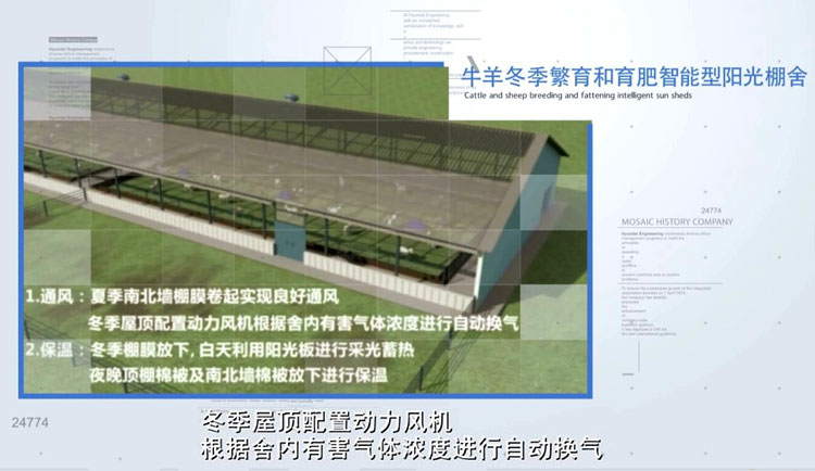棚舍從設計、施工均為標準化模塊進行,冬季不需任何供暖,白天利用陽光板進行采光蓄熱,夜晚頂棚棉被及南北墻棉被放下進行保溫,可實現畜牧棚舍外界零下30攝氏度,內部達到零上5攝氏度的環境條件。夏季南北墻棚膜卷起實現良好通風。冬季屋頂配置動力風機,根據舍內有害氣體濃度進行自動換氣。