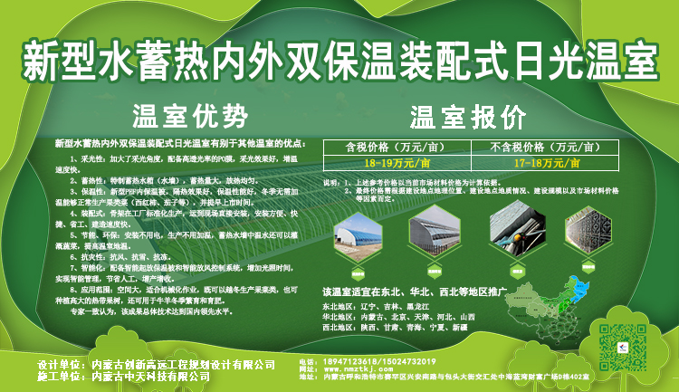 水蓄熱內外雙保溫裝配式日光溫室是由內蒙古農業大學與內蒙古中天科技有限公司聯合研發完成,并已在東北、西北、華北等地區進行了大面積的示范推廣。該溫室集成了10多項國家專利技術,實現了北方寒冷地區冬季不加熱正常生產果菜類蔬菜,對于推動設施蔬菜產業發展及帶動當地農民增收致富有著非常重要的意義,該溫室具備以下特點: