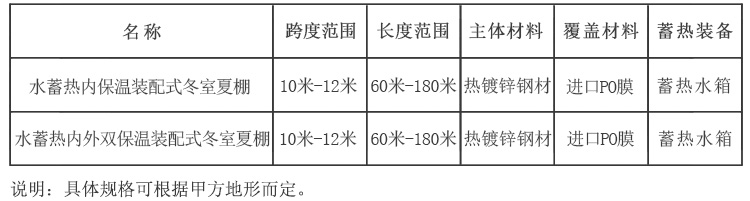 水蓄熱內(雙)保溫裝配式冬室夏棚配套設備包括:溫室主體、骨架系統(tǒng)、外膜系統(tǒng)、內膜系統(tǒng)、(前坡上、前坡下、后墻下)放風系統(tǒng)、內保溫系統(tǒng)、外保溫系統(tǒng)、后墻保溫系統(tǒng)、新型水蓄熱系統(tǒng)、安裝系統(tǒng)、供電系統(tǒng)。