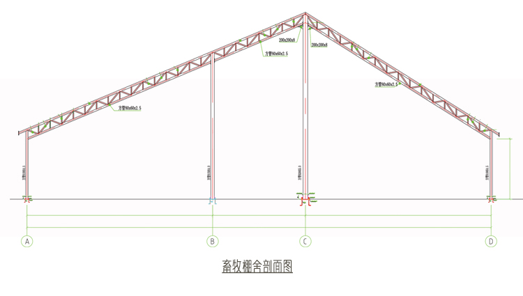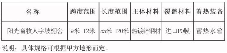 陽光畜牧人字坡棚舍配套設備包括:基礎、骨架系統、內保溫系統、立面放風系統、換氣系統、熱飲水系統、配電柜、覆蓋系統(東西墻、后坡、前坡等)等。