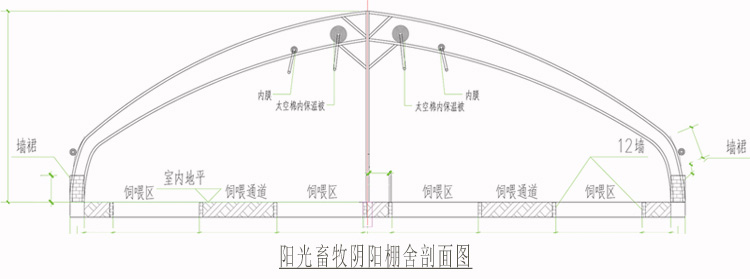 11、這種內保溫陰陽棚棚舍,可大幅度的提升棚舍的保溫和蓄熱,更好的保證冬季夜間棚舍的溫度,對牛羊的增產起到保證作用。